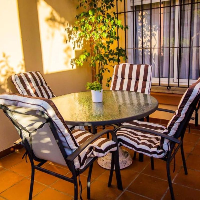 La casa cuenta con una terraza con vistas a la piscina comunitaria.