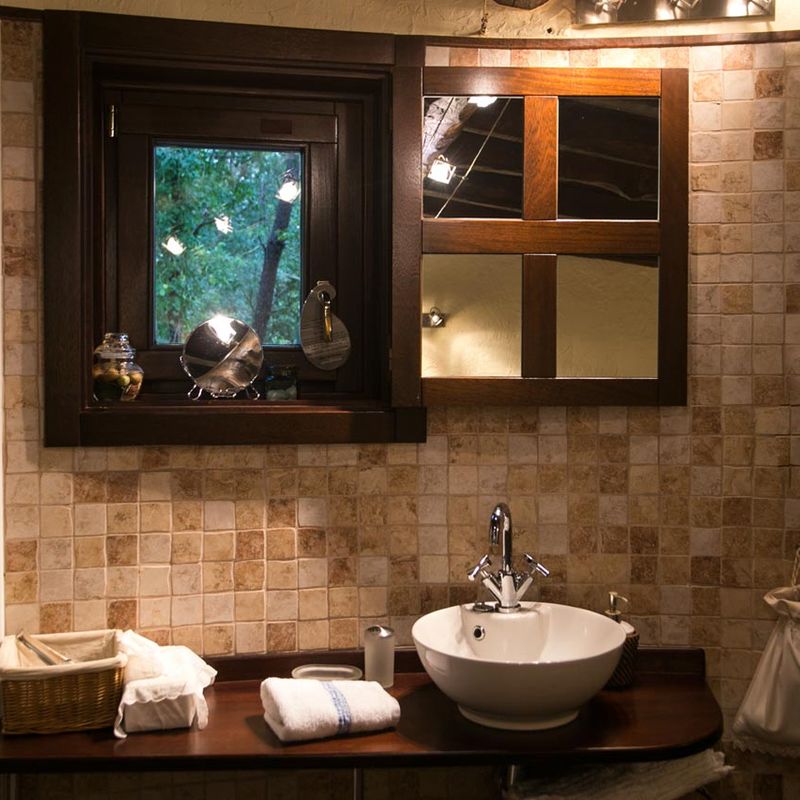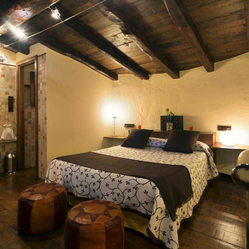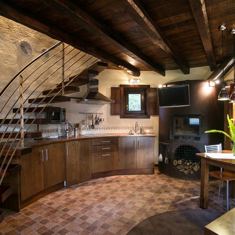 Casiña Rústica (apto.) con distribución circular (tipo dúplex). En la planta baja podemos encontrar una cocina-comedor-sala con chimenea y televisión de plasma. Además, dispone de nevera bajo encimera, microondas, tostador, exprimidor, cafetera, menaje necesario de cocina... En la planta superior se encuentra una amplia habitación con televisión de plasma y baño con ducha, secador de pelo, amenities, etc.